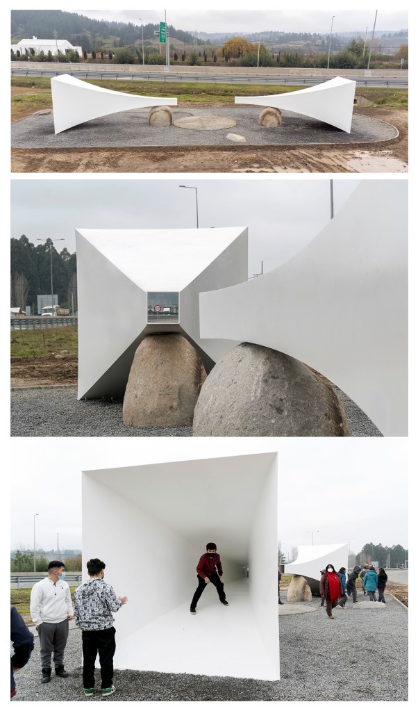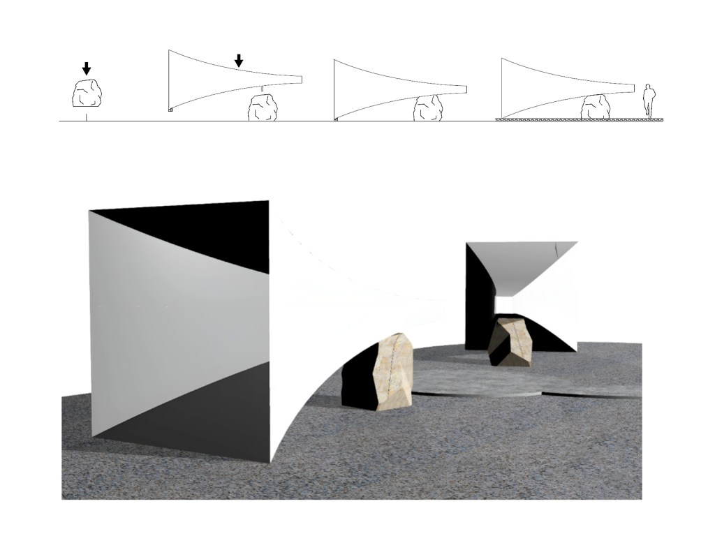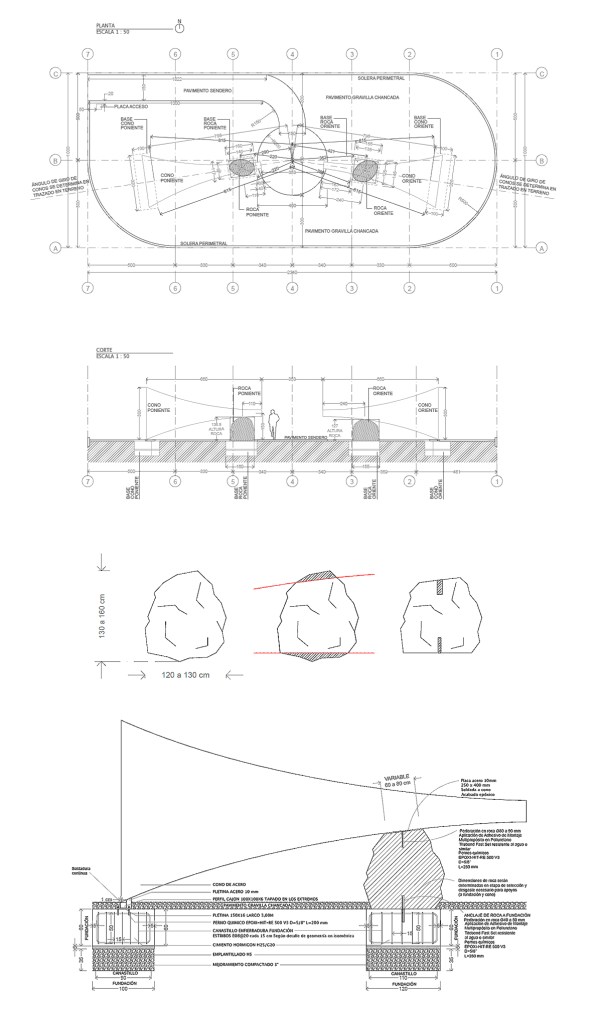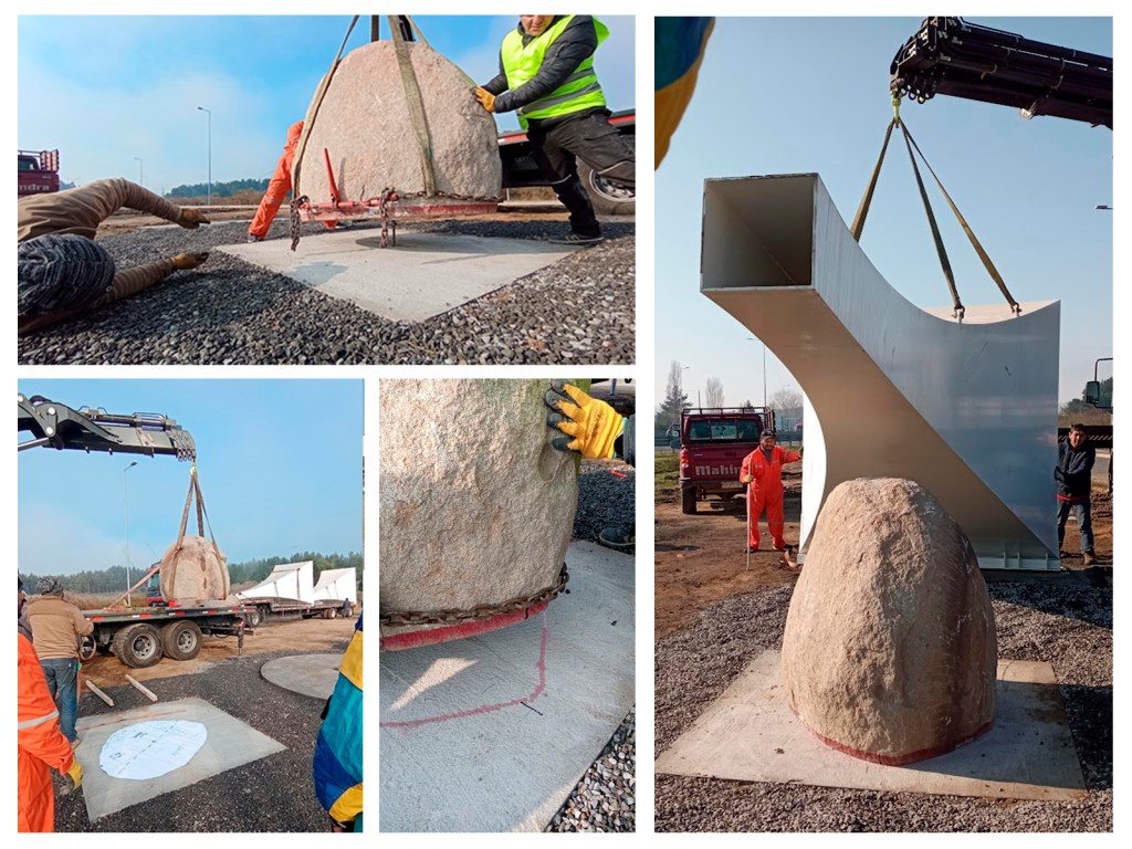 Design of details, production and supervision of construction of a public art sculpture in metal 12 mm and natural rocks. By artists Pablo Schalscha and Lukas Kühne. 2022