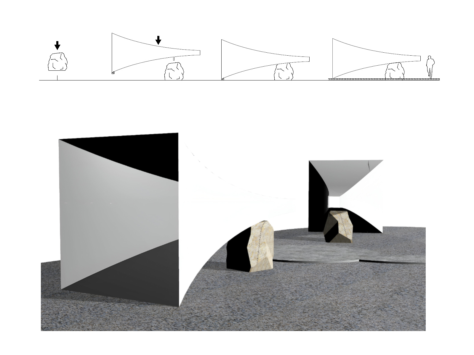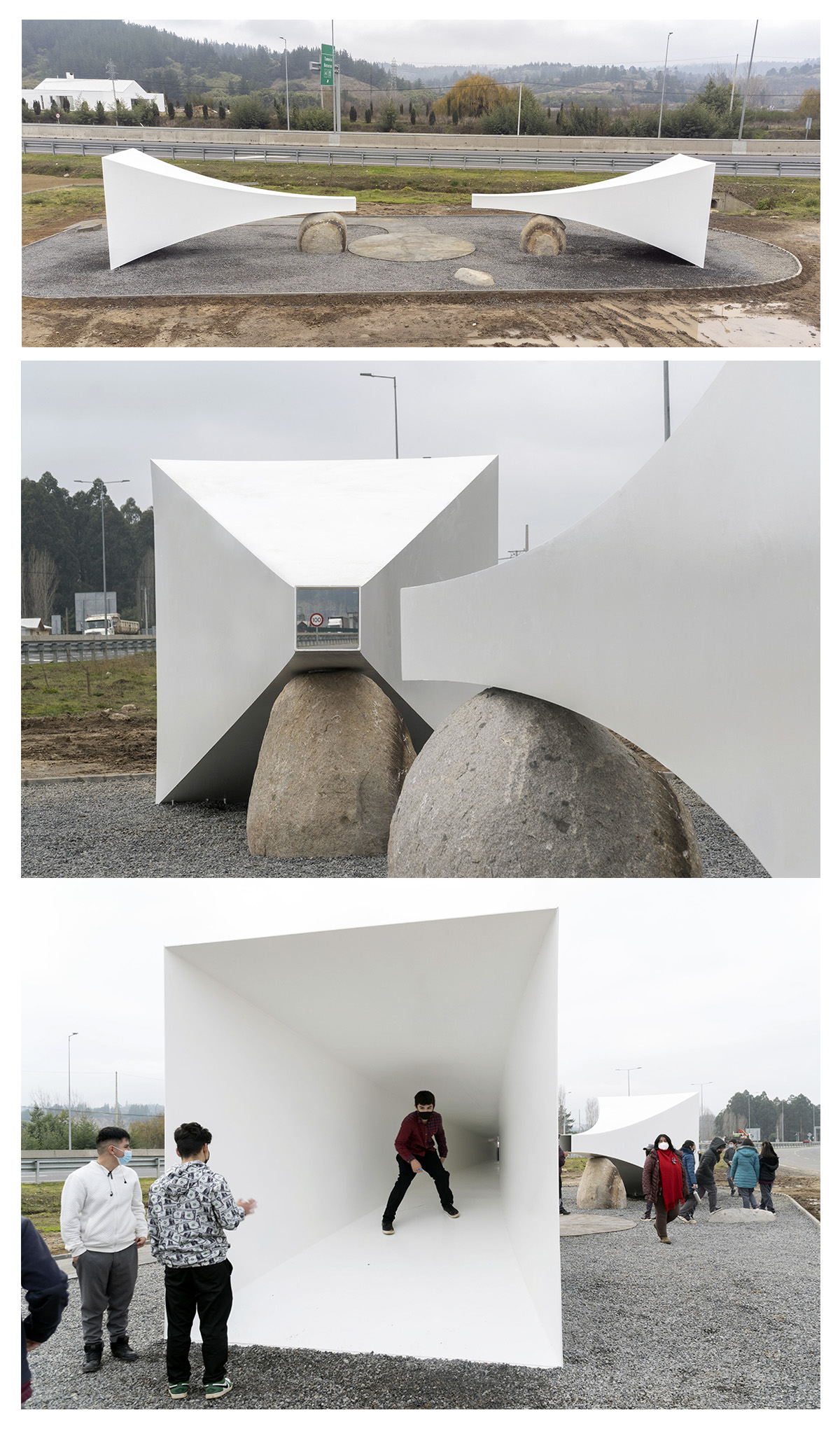 Design of details, production and supervision of construction of a public art sculpture in metal 12 mm and natural rocks. By artists Pablo Schalscha and Lukas Kühne. 2022